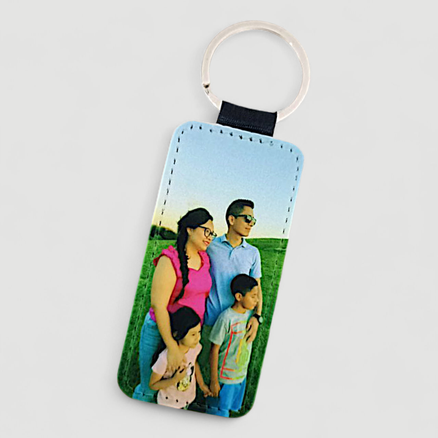 Lleva tus recuerdos contigo con este llavero personalizable. Añade tu foto favorita en una cara y disfruta del elegante acabado símil piel negro en la otra. Su diseño rectangular (3,5 x 8 cm) es moderno, práctico y perfecto para un detalle único y especial.